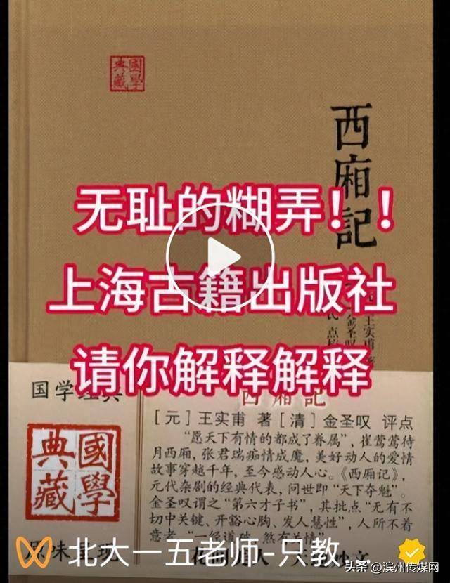 12月2日银泰证券,博主“一五老师”发视频称,上海古籍出版社“国学典藏”系列《西厢记》里面出现大量错误。