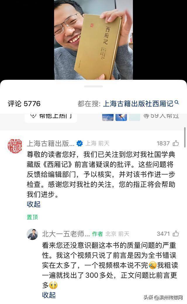 九派新闻记者发现,12月2日,上海古籍出版社在评论区回应称:“尊敬的读者您好银泰证券,我们已关注到您对我社国学典藏版《西厢记》前言诸疑误的批评。这些问题将反馈给编辑部门,予以核实,并对该书作进一步检查。感谢您对我社的关注,您的指正将会帮助我们进步。”