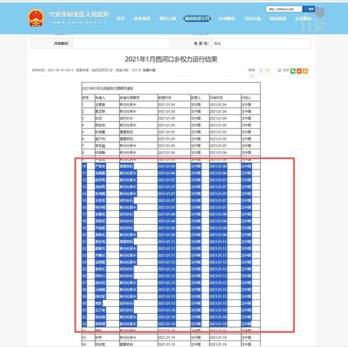 据媒体此前报道,网友12月7日反映,安徽省六安市裕安区人民政府官网政务公开栏目公布的2021年1月西河口乡权力运行结果中的《2021年01月为民服务办理事项清册》竟与百度文库一份“姓名大全2”中的姓名及排序完全吻合,此事引发网友质疑。