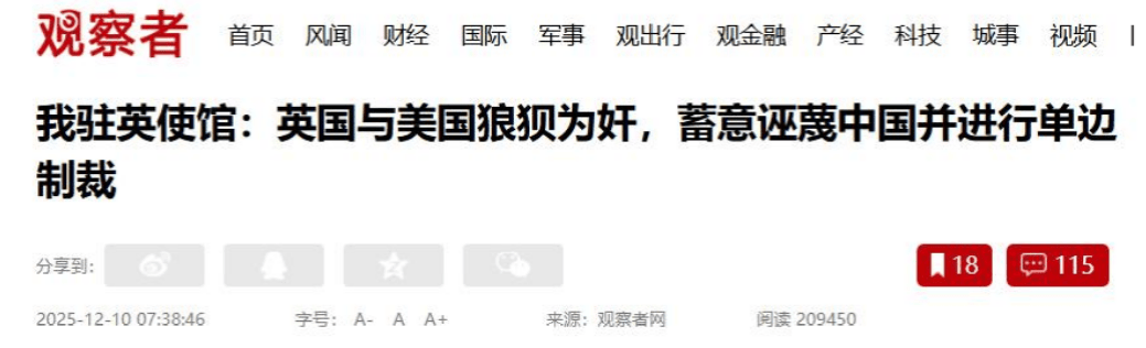 首先,中国驻英大使馆对此反应强烈,直指英国与美国狼狈为奸、蓄意污蔑中国。这种表态并不是简单的外交辞令,而是对英国单边制裁行为的坚决反击和严正交涉。中方的立场清晰明了,呼吁英国立即撤销这一不当行为,停止对中国企业的污蔑与抹黑。可以说,此番回应不仅显示出中方捍卫自身合法权益的决心,更是向国际社会发出了警示信号。